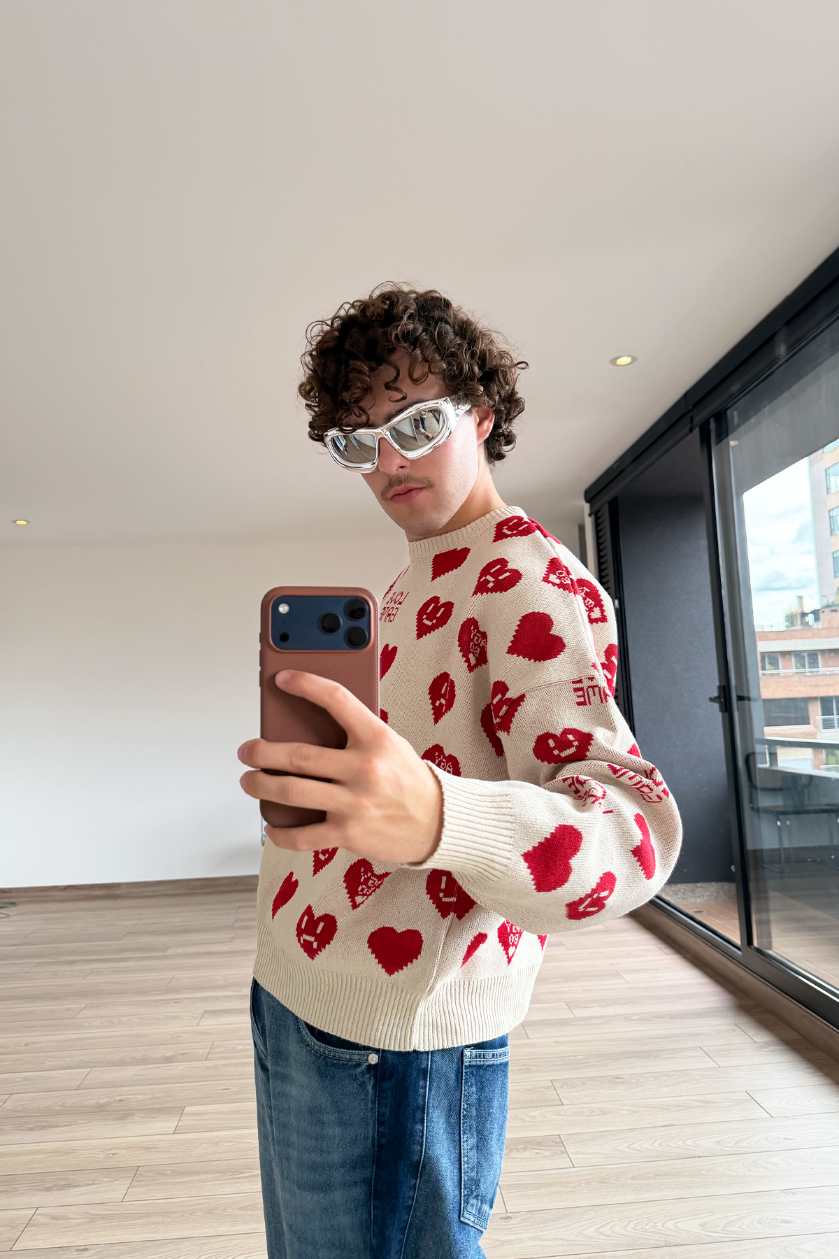 Sweater tejido de la colección LOVE GAME, tiene un diseño de corazones alrededor de toda la prenda.