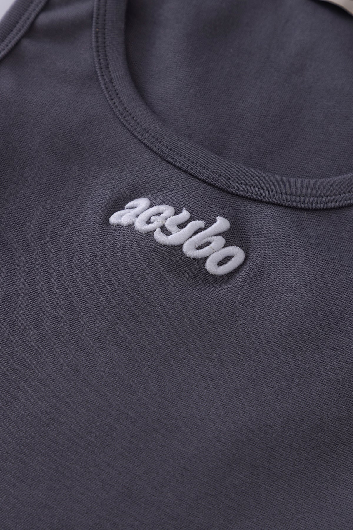 Pit crew zipper tank top en color gris, con bordado blanco central y cremallera metálica en el costado izquierdo.